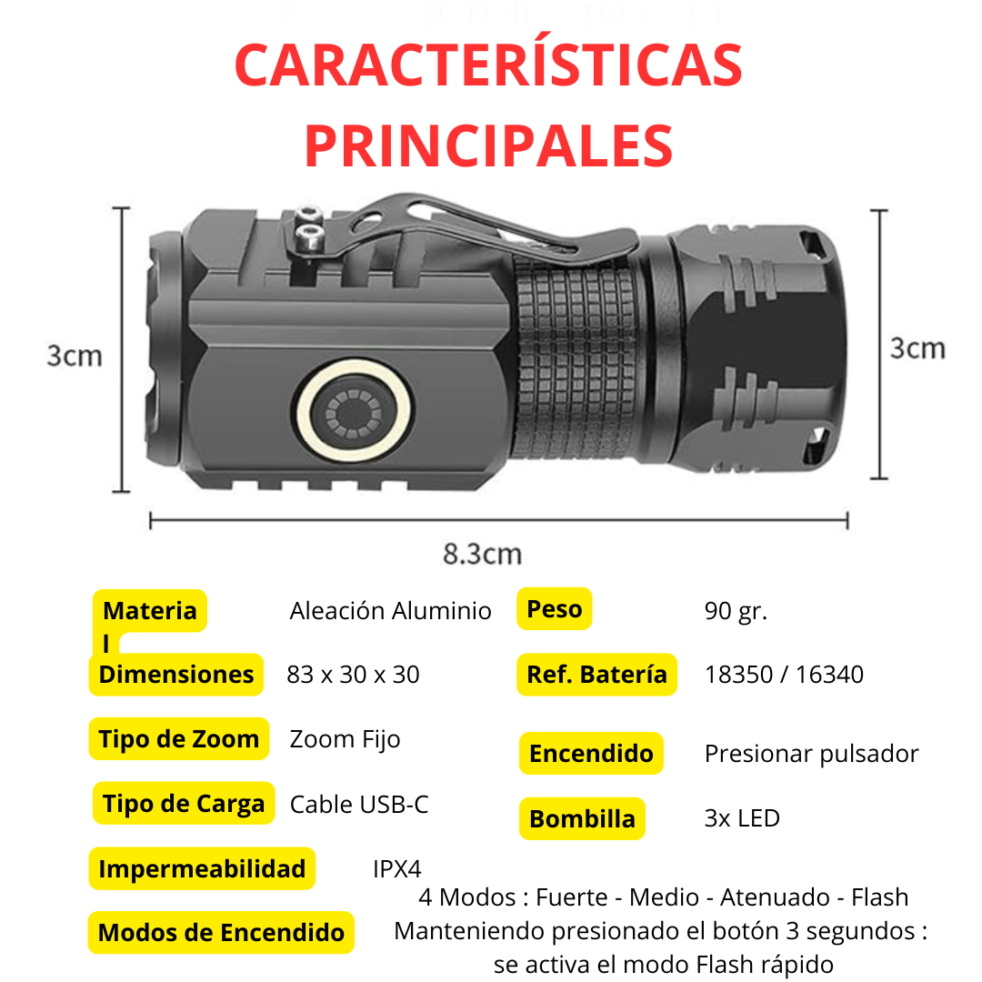 Potente haz en la palma de tu mano. Una linterna compacta capaz de iluminar intensamente incluso en total oscuridad. Su tamaño reducido no compromete su potencia. Es ideal para cortes de luz, tareas técnicas o exteriores. Fácil de usar, resistente y práctico. Te acompaña en todo momento.